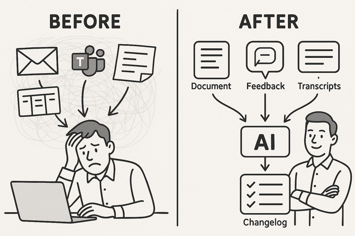 🔑 Key Takeaway: Learn how to use AI to automate and streamline changelog creation across complex, multi-stakeholder deliverables — minimizing confusion, redundancy, and versioning chaos.