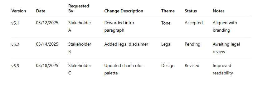 “Please create a changelog table with the following columns: Version | Date | Requested By | Change Description | Theme | Status | Notes. Use the attached transcript, stakeholder list, and screenshots to identify and tag each edit. Group changes by theme in a summary at the top of the document.”
